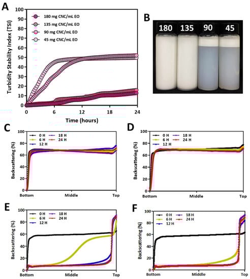 The backscattering of light through each emulsion is shown in Figure 2C–F. The stability of emulsions was sustained without any significant phase separation with 135 and 180 mg CNC/mL EO emulsions during storage for 24 h (Figure 2C,D). In contrast, phase separation was observed in 6 h for emulsions prepared with 45 and 90 mg CNC/mL EO compositions (Figure 2E,F). This demonstrated that there is a critical concentration of CNCs required for completely covering EO and ensuring the long-term stabilization of CNC-based PEs. These results suggest that 135 mg CNC/mL EO could be close to the critical concentration of CNC/EO emulsions.