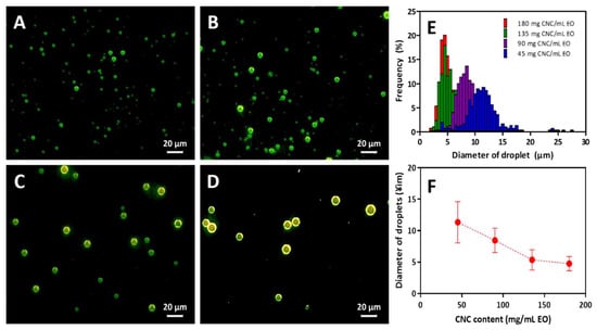 Spherically shaped emulsion particles were observed with a dark field microscope as shown in Figure 3A–D. The dark-field microscopic image clearly shows the contours of solid particles, as well as their size distribution. The shell structure implies that the liquid phase was enclosed in the solid phase. The shell consisted of CNC particles because light scattering occurred at the edge of the solid particles. Thicknesses of the shell were similar regardless of the CNC/EO compositions, meaning that the assembly of CNCs was regular and uniform. The size of the PE decreased as the CNC content increased. The average shell size of the 45 mg CNC/mL EO PE was about 14 µm, and a broad size distribution was observed. It decreased to about 5 μm for 135 and 180 mg CNC/mL EO PEs with comparatively narrower size distributions (Figure 3E,F).