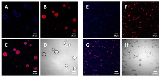 The enclosure of liquid EO in the CNC shell was confirmed with confocal microscope images (Figure 4). CNCs were labeled with blue fluorescent dye and were observed only at the boundary of the emulsion particles (Figure 4A,C). Meanwhile, the EO labelled with red fluorescent dye was observed at the inner region of the emulsion (Figure 4B,C). Smaller-sized EO droplets were contained in the CNC PE with a higher content of CNCs in the emulsion (Figure 4E–G). The emulsion particles were spherical and were well dispersed in the aqueous phase without aggregation (Figure 4D,H).
