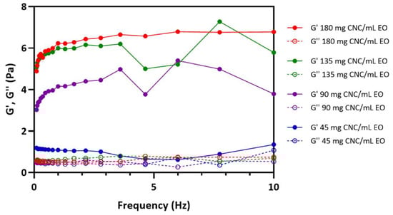 The rheological properties of the CNC/EO emulsion were investigated as a function of the CNC content (Figure 5). The dynamic mechanical properties of the emulsions showed that the elastic storage modulus () was higher than the viscous storage modulus () in the frequency range of 0.1 to 10 Hz, and the PEs appeared to be a gel in this range.