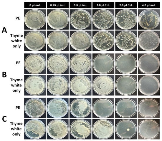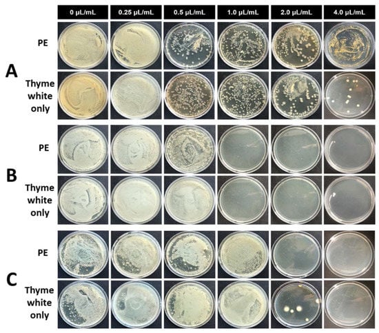 Antimicrobial activity of CNC/EO PEs and thyme white only against S. aureus at different concentrations of EO. The extracts were diluted 1000 times and spread on an agar plate after storage for (A) 0 d, (B) 10 d, and (C) 25 d.
