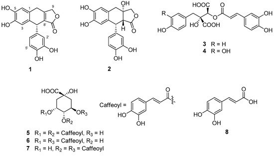 Compounds 3–8 were identified as cimicifugic acid D (3) [17], fukinolic acid (4) [7], 3,4-dicaffeoylquinic acid (5) [18], 3,5-dicaffeoylquinic acid (6) [18], 4,5-dicaffeoylquinic acid (7) [18], and caffeic acid (8) [19] by comparison of their NMR data with those reported.