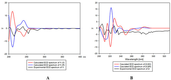 Comparison of experimental and calculated electronic circular dichroism (ECD) spectra of compounds 1 (A) and 2 (B).