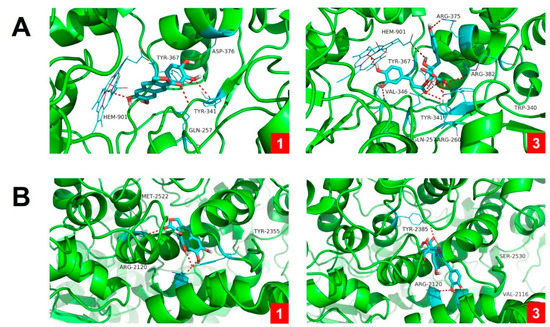 Molecular docking results of compounds 1 and 3 with iNOS (A) and COX-2 (B) enzymes. Molecular docking simulations obtained at the lowest energy conformation, highlighting potential hydrogen contacts of 1 and 3, respectively (nitrogen is blue; oxygen is red; carbon is cyan; hydrogen is gray). For clarity, only interacting residues are labeled. Hydrogen bonding interactions are shown by dashes. These figures were created by PyMOL (Schrödinger, LLC, New York, NY, USA: version 1.3).