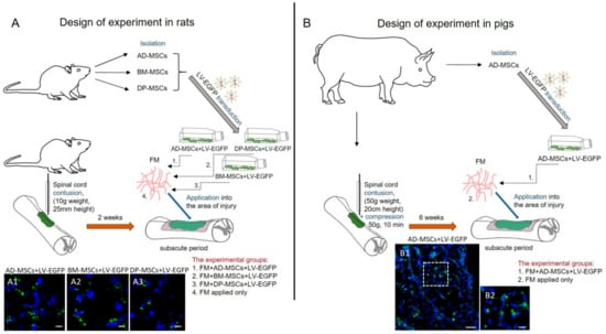 Study design in rodent and porcine models. (A) For experiments in rats, mesenchymal stem cells derived from bone marrow (BM-MSCs), adipose tissue (AD-MSCs), and dental pulp (DP-MSCs) were isolated, transduced by lentiviral vectors encoding enhanced green fluorescent protein (LV-EGFP) at passage 0 and cultivated up to passage 3. Two weeks after spinal cord injury (SCI) the obtained cells embedded in fibrin matrix (FM) were used for allogenic application into the area of injury. (A1–A3) Lower panels illustrate EGFP+-cells at day 14 after application of AD-MSCs, BM-MSCs, and DP-MSCs, transduced by LV-EGFP, in dorsal root entry zone (DREZ). Scale bar: 5 µm. (B) For experiments in pigs, AD-MSCs were isolated, transduced by LV-EGFP at passage 0 and cultivated up to passage 3. Six weeks after SCI the obtained cells embedded in FM were used for autologous application into the area of injury. (B1,B2) Lower panels illustrates EGFP+-cells at day 14 after application of AD-MSCs, transduced by LV-EGFP, in DREZ. The area marked in B1 with dashed boxed areas; corresponds to the enlarged image B2. Scale bars: 50 (B1) and 10 (B2) µm.