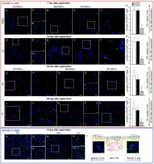 Distribution and survival of MSCs encapsulated in FM after application into the area of SCI in rats (red box) and pigs (blue box). MSCs predominantly migrate through the posterior roots of the spinal cord. In the early periods (7–14 days post-transplantation) labeled by LV-EGFP (green) AD-MSCs, BM-MSCs, and DP-MSCs were located mainly in (A–C) DREZ and (D–F) central canal (CC) in rats. During late periods (30–60 days post-transplantation) labeled LV-EGFP cells were also observed in the (G–I) ventral horns (VH) and (J–L) ventral funiculi (VF) in rats. The (A–L) areas marked with a dashed boxed correspond to enlarged images A’–L’. Number of EGFP+-cells at days (M,N) 30 and (O,P) 60 at 4 mm rostrally and caudally from the injury site in VH of experimental groups with MSCs transplantation. At day 14, LV-EGFP MSCs (green) were mainly located in the area of DREZ, (Q) dorsal funiculi (DF), (R) dorsal horns (DH), and (S) CC in pigs. The Q and R areas marked with a dashed boxes correspond to enlarged images Q’ and R’, respectively. (T) MSCs distribution can be seen in the area of epidural fibrosis (gray line above spinal cord longitudinal section) according to the distance from injury site. MSCs were also detected in the area of epidural fibrosis, where more MSCs were found above the epicenter of injury and in the caudal direction, and less in the synechias above the rostral part of spinal cord. Asterisk indicates CC. Color dashed boxes (brown—rostral part; blue—epicenter of injury; green—caudal part) in scheme indicate corresponding area with MSCs distribution. Nuclei are stained with DAPI (blue). Scale bars: (A–L) 20, (H’) 10, and (A’–G’,I’–J’–L’) 5 μm; (Q,R) 50, (S) 20 and (Q’,R’,T’,E’, brown and green dashed boxes) 10 μm.