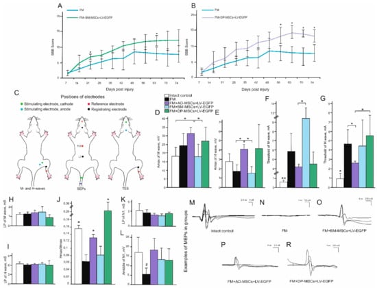 Behavioral and electrophysiological studies after SCI in experimental groups of rats. BBB locomotor scores of rats of the FM only (blue line), FM + BM-MSCs + LV-EGFP (green line), and FM + DP-MSCs + LV-EGFP (purple line) groups (A,B). The motor function scores were significantly higher after AD-MSCs and DP-MSCs application than those in the FM group 8 and 4 weeks postinjury, respectively. The lowest results in locomotor recovery between groups with MSC therapy were shown after application of BM-MSCs, where average BBB scores were higher at 3 and 9 weeks postinjury and not significantly different on week 11 compared to control group. * p < 0.05 as compared with the control group (FM), one-way ANOVA followed by a Tukey’s post hoc test. Schematic illustration of electrodes positions in rats (C). Amax of M- (D) and H-wave (E), threshold of M- (F) and H-waves (G), LP of M- (H) and H-waves (I), H/M wave amplitude ratio (J), LP (K) and Amiddle (L) of lumbar N1 after SCI in the experimental groups (X axis). At day 74 after SCI, the positive dynamics of the ratio Hmax/Mmax responses restoration was marked in groups with AD-MSCs and DP-MSCs application. At the same time, there was a decrease in Amax of N1 in the FM only group. * p < 0.05; ** p < 0.01; # p < 0.05 as compared with intact control and experimental group treated with AD-MSCs (one-way ANOVA followed by a Tukey’s post hoc test). Electrophysiology results demonstrate motor evoked potentials (MEPs) before SCI (M) and on week 11 in FM (N), FM+BM-MSCs+LV-EGFP (O), FM+AD-MSCs+LV-EGFP (P), and FM+DP-MSCs+LV-EGFP (R) groups.
