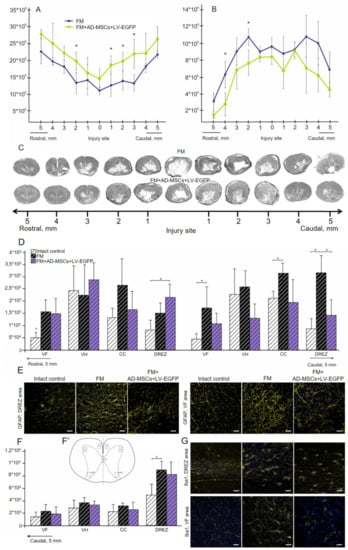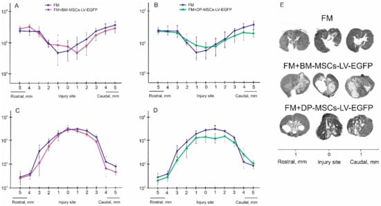 Spinal cord morphometry in experimental groups of rats. (A,B) An area of the spared tissue and (C,D) a total area of abnormal cavities, 5 mm rostrally and caudally from the injury epicenter at 60 day after treatment with FM (blue line), FM + BM-MSCs + LV-EGFP (purple line) or FM + DP-MSCs + LV-EGFP (green line). * p < 0.05, one-way ANOVA followed by a Tukey’s post hoc test. (E) Cross-sections of the injured spinal cord at 74 day after SCI in experimental groups at a distance of 1 mm rostrally and caudally from the injury epicenter. Azur-eosin staining. Previously obtained results in FM + AD-MSCs + LV-EGFP group are available in our article [7]