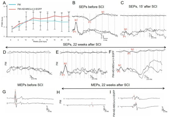 H-response was absent in intact rats in 33% of cases [41] and in groups treated with AD-MSCs, BM-MSCs, and DP-MSCs H-response was absent in 40, 37.5, and 25% of cases, respectively. At the same time, in the control group with FM application only, the H-response was recorded in all cases, indicating facilitation of monosynaptic circuit following injury, which could be partially inhibited by supralisional influences in control and treated animals. At day 74 after SCI, the LP of H-wave remained unchanged in all investigated groups and a positive trend in the recovery (p < 0.05) of the Hmax/Mmax response rate was found in groups with AD-MSCs and DP-MSCs (Figure 3J), which could reflect the recovery from spinal shock.