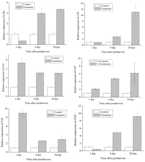 Significant upregulations in CHS and CHI levels were observed in the treated citrus peel. The mRNA levels of CHS were increased by 3.0- and 3.4-fold in ozone-treated on 4 d and 30 d. The levels of CHI transcripts in ozone treated citrus peel showed an increment on day 4, with the highest induction of an 11.1-fold increase observed on 30 d. The expression of the GLU gene in the treated peel samples reached the highest level after 1 d storage and then declined on 4 d and 30 d. However, the overall gene expression levels in samples obtained from ozone treatment were significantly higher than the levels observed in the control citrus fruit peel. The treatment of Satsuma mandarin with ozone maintained the increases in CHT and PAL mRNA transcripts during different storage periods. The expressions of CHT were 2.1, 4.8, and 6.2-fold, and the expressions of PAL were 9.0-, 2.6-, and 3.0-fold higher than in the controls on 1 d, 4 d, and 30 d, respectively.
