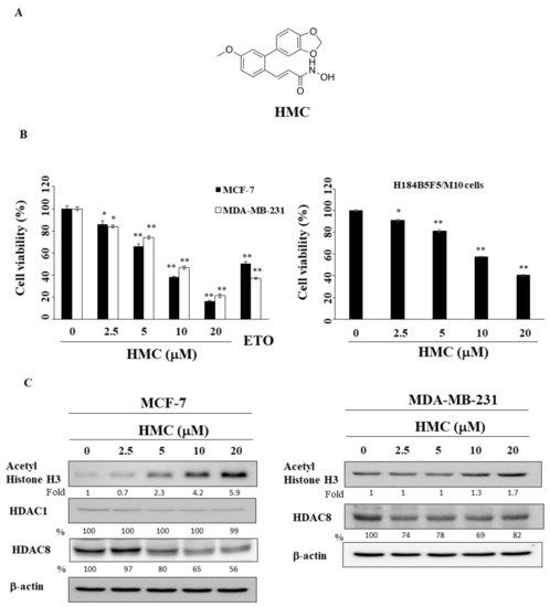 Antiproliferative effects of HMC in breast cancer cells and normal human breast epithelial cells. (A) The chemical structure of HMC. (B) Left panel, cells were treated with DMSO or HMC at the indicated concentration for 48 h, cell viability (MTT assay) were tested. Positive control: 20 μM or 30 μM etoposide was used as positive control. (MCF-7 or MDA-MB-231cells). Right panel, Non-tumorgenic human breast epithelial cell line H184B5F5/M10 was treated with HMC for 48 h, and cell viability was determined by MTT assay. Points, means; bars, SD (n = 4–6). * p < 0.05, ** p < 0.01. (C) Western blot analysis of acetyl Histone H3, HDAC1, and HDAC8 in HMC-treated cells for 48 h. Left panel, MCF-7 cells. Right panel, MDA-MB-231 cells. The values in percentage or fold denote the relative intensity of protein bands of HMC treated samples to that of the respective DMSO vehicle control after being normalized to the respective internal reference (β-actin).