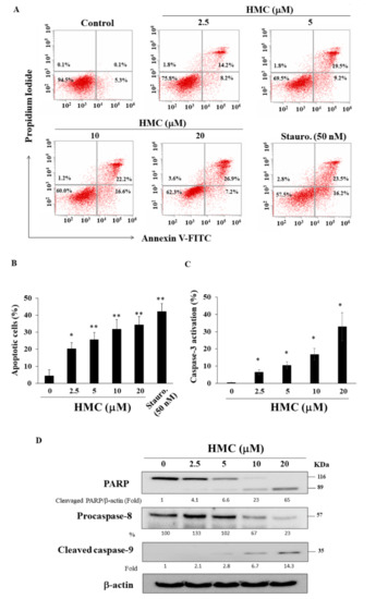 Several lines of evidence indicate that the antiproliferative effect of HMC was attributable to its ability to induce apoptosis in MCF-7 cells. For example, flow cytometric analysis of Annexin V/PI staining shows increases in annexin V-positive cells in response to HMC treatment in a concentration-dependent manner (Figure 2A,B; staurosporine as the positive control). In addition, flow cytometry demonstrated that HMC dose-dependently increases caspase-3 activities in MCF-7 cells (Figure 2C), and Western blot analysis showed increased levels of the cleavage PARP and caspase-9, accompanied by decreased expression of procaspase-8 (Figure 2D).
