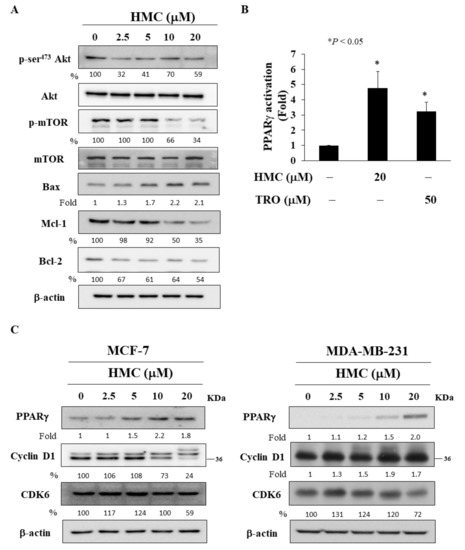 HMC modulates the expression of various biomarkers in breast cancer cells. (A) Phosphorylation/expression of Akt, mTOR, Bax, Mcl-1, and Bcl-2 after the treatment of HMC in MCF-7 cells. (B) PPARγ promoter transactivation in HMC-treated MCF-7 cells. 50 μM troglitazone (TRO) was used as positive control. (C) Levels of PPARγ, cyclin D1, and CDK6 in HMC-treated cells for 48 h. Left panel, MCF-7 cells. Right panel, MDA-MB-231 cells. The values in percentage or fold denote the relative intensity of protein bands of HMC treated samples to that of the respective DMSO vehicle control after being normalized to the respective internal reference (total respective protein or β-actin).