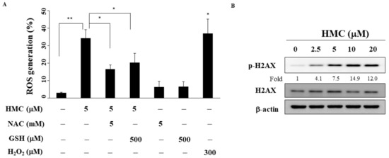 HMC increased reactive oxygen species (ROS) production. (A) Cells were treat with HMC alone or in combination of 5 mM N-acetylcysteine (NAC) or 500 μM glutathione (GSH) for 24 h. 300 μM H2O2 was used as positive control. SD (n = 3) * p < 0.05, ** p < 0.01. (B) Effects of HMC on the phosphorylation and expression of H2AX in MCF-7 cells. The values in fold denote the relative intensity of protein bands of HMC treated samples to that of the respective DMSO vehicle control after being normalized to the respective internal reference (total respective protein).