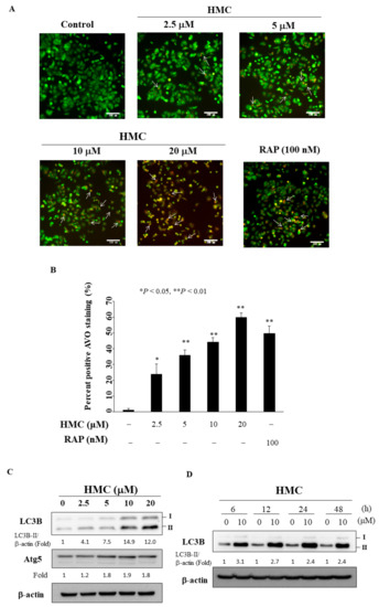 Substantial evidence has shown the ability of pan-HDAC inhibitors to promote autophagy [26,27]. During autophagy, the formation of acidic vesicular organelles (AVOs) is one of the characteristic features of cells engaged in autophagy in response to starvation or radiation [28]. Thus, we examine drug-induced cellular acidification by using acridine orange staining, in which cytoplasm fluorescence changed from bright green to bright red. As shown in Figure 5A,B, the generation of AVOs increased after the treatment of HMC in a concentration-dependent manner in MCF-7 cells (rapamycin as the positive control). In addition, immunoblotting shows HMC-induced increases in the expression of LC3B-II and autophagy-related (Atg)5 in MCF-7 cells (Figure 5C), both of which are important markers for autophagosome formation [29,30]. In addition, time-course experiments demonstrated that LC3B-II expression increased after 6 h of HMC treatment (Figure 5D).