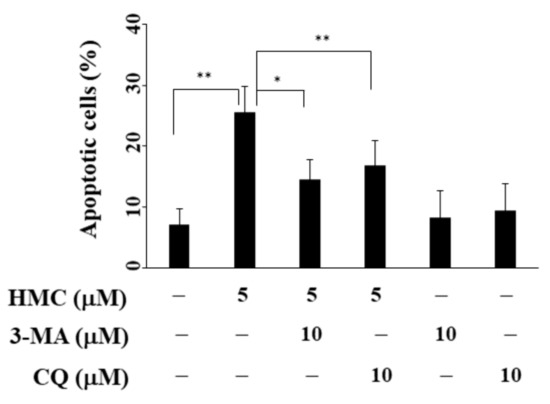 Co-treatment of autophagic inhibitor partially reversed HMC-induced apoptosis. MCF-7 cells were treated with HMC alone or in combination of 3-methyladenine (3-MA) or chloroquine (CQ) for 48 h and stained with propidium iodide (PI)/annexin V. SD (n = 4) * p < 0.05, ** p < 0.01.