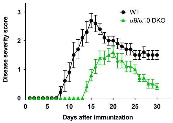 In our earlier work, we demonstrated that there is delayed onset and diminished severity of EAE in nAChR α9 subunit KO animals when compared to WT littermates [17]. Although these protective effects are clearly evident, there is incomplete elimination of EAE in α9 KO mice. To address the possibility that nAChR α10 subunits engage in any of several mechanisms to affect autoimmunity (see Introduction), studies were done with mice lacking both nAChR α9 and α10 subunits, monitoring their EAE response following mouse MOG inoculation. Importantly, well-established disease provocation conditions were modulated so that peak disease severity for WT animals used as positive controls in this study was very similar to that for WT controls used in our earlier studies, and at a level that avoids ceiling or floor effects, this allowing for results to be compared across those studies (see Materials and Methods). MOG-immunized mice typically develop a maximum level of EAE followed by symptomatic improvement when neuroinflammation wanes [51], but most MOG-immunized mice retain some degree of neurodeficit. Relative to the time course for development of EAE and its severity in WT C57BL/6J mice, there is reduced peak disease severity in α9/α10 DKO animals (2.7 ± 0.3 for WT, but 1.6 ± 0.2 for DKO animals; p = 0.0003, Mann–Whitney test; Figure 1; see also Table 1 for additional assessments of mean disease severity score at day 15 and for cumulative disease scores and statistical comparisons). There is delayed onset of disease signs in α9/α10 DKO mice (14 days until first animal evidence of disease and 14.6 days average onset for α9/α10 DKO mice; eight days for first animal onset of disease signs and average onset at 9.6 days for WT mice). The time when there is a peak in disease severity also is later in α9/α10 DKO animals (day 20) than in WT littermate controls (day 15), and percent recovery from peak disease is better in α9/α10 DKO mice (75%) than for WT littermates (46%; disease severity at day 30 compared to disease severity on the day of peak disease; p < 0.05). Protection against EAE again is incomplete (i.e., even in DKO animals, there are disease signs). However, the magnitude of reduction in disease severity relative to that seen in WT controls and the delay in disease onset and peak disease expression are indistinguishable from effects seen for α9 KO alone or for nicotine treatment of WT animals, all on the same background (compare Figure 1 to [17]). That is, the average time of disease onset in previously-published studies was 8.7 days for WT animals, 14.5 days for α9 KO mice, and 15.7 days for nicotine-treated mice [17]. Peak disease severity was 2.7, 1.5, and 1.3, respectively, for those cohorts [17].
