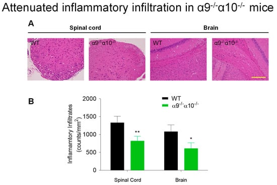 H&E staining for infiltrating immune cells was done at peak disease, 14 days after MOG inoculation, to assess levels of immune cell infiltration into the brains (corpus callosum) and spinal cords (cervical enlargement) of EAE mice. Results reveal that there is reduced (~40%) inflammatory cell presence in both central nervous system domains in α9/α10 DKO mice compared to levels in WT littermates (1330 ± 180 cells/mm2 in WT versus 820 ± 130 in DKO animal spinal cords, p = 0.008; 1080 ± 190 cells/mm2 in WT versus 610 ± 160 in DKO mouse brains, p = 0.02; Figure 2). We previously observed that nicotine exposure, which has effects indistinguishable from, and neither synergizing with nor counteracting, those in α9 KO animals, induced an about 70% reduction of immune cell infiltration into the spinal cord, measured 25 days after inoculation [31].