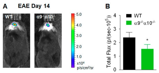 Similarly, measures were done of ROS imaged in vivo in the brain area of interest (corpus callosum) and defined by Luminol emission levels [illustrated here for animals at disease peak for WT mice, 14 days post-EAE induction; quantified as p/(sec-105)]. ROS levels also are reduced, by about 30%, in α9/α10 DKO mice (1.5 ± 0.3) relative to WT animals (2.4 ± 0.4; p = 0.04; Figure 3). A similar degree of ROS reduction (25–50%) was seen before in the brains of animals subjected to nicotine treatment and also measured 14 days after inoculation [15,32].