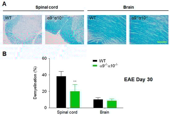 Reduced demyelination in EAE α9/α10 DKO mice. (A) Luxol blue staining reveals the intensity of myelin integrity in brain or spinal cord sections from wild-type (WT) or nAChR α9/α10 subunit DKO mice (α9−/−α10−/−) at day 30 after immunization. Scale bar: 50 µm. (B) Quantified data show reduced demyelination in spinal cords of α9/α10 DKO mice. N = 3 mice per group, at least four sections examined per mouse, n ≥ 12. Mean ± S.E.M.; unpaired t-test; ** p < 0.01.