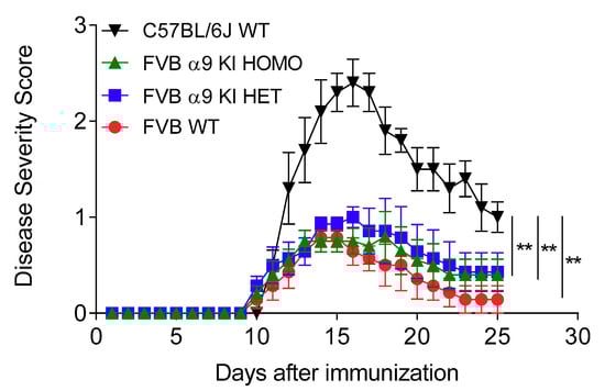 Effects of a nAChR α9 subunit gain-of-function (GOF) mutation on EAE severity. EAE disease symptom evaluation was done for groups of wild-type (WT) mice on the C57BL/6J background (C57BL/6J WT, ▼n = 5), or for nAChR α9 subunit knock-in heterozygotes (FVB α9 KI HET, ■, n = 7), homozygotes (FVB α9 KI HOMO, ▲, n = 10) or their WT littermate controls (FVB WT, ⬤, n = 7) on the FVB.129P2-Pde6b+ Tyrc-ch/AntJ (FVB) background. Reduced EAE severity was seen on FVB WT, FVB α9 KI HET, and FVB α9 KI HOMO mice as compared to C57BL/6J WT mice. Mean ± S.E.M.; Mann–Whitney test; ** p < 0.01 for the FVB cohorts relative to C57BL/6J WT mice.
