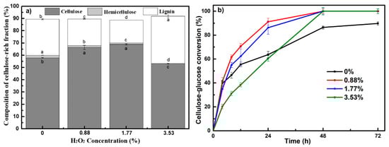 Main composition and enzyme hydrolysis of cellulose-rich fraction resulting from various H2O2 input during PHP pretreatment. (a) Main chemical composition; (b) Performances of enzyme hydrolysis (the employed solid loading for hydrolysis was 2%, CTec2 dosage was 20 mg protein per gram cellulose).
