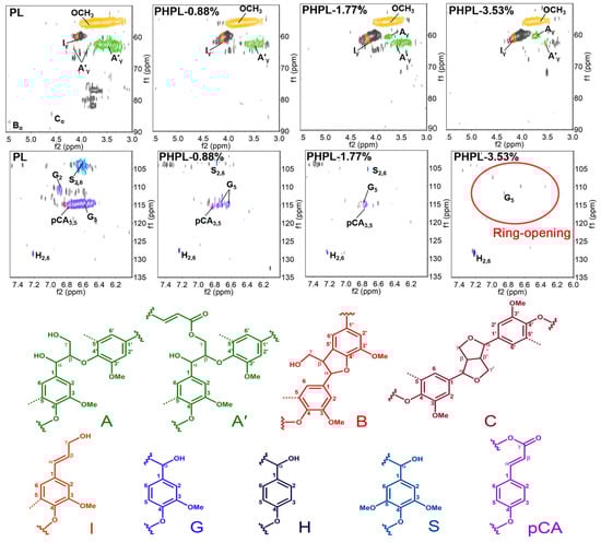 2D-HSQC NMR spectra of PL and PHPLs. Side-chain linkages: (A) β-O-4′ structures, (A′) γ-acylated β-O-4′ substructures, (B) β-5′ phenylcoumaran substructures, (C) β-β′ resinol substructures. Aromatic units: (G) guaiacyl units, (H) p-hydroxyphenyl units, (S) syringyl units, (pCA) p-coumarate. The uncolored cross peaks are signals of sugars or unidentified lignin substructures.