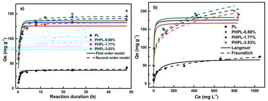 It is well known that hydroxyl and carboxyl acid groups as the surface functional groups on lignin can bond metal ions, dyes and organics with the lignin via electrostatic attraction, ion-exchange and complexation []. To assess the potential of adsorption ability on cationic substances by PHPLs, MB, as a typical cationic dye, was firstly selected here as a model compound []. The pseudo-first-order and pseudo-second-order kinetic model and the Langmuir and Freundlich isotherm models were employed to investigate the MB adsorption behaviors by the harvested lignins (see Figure 3) [].