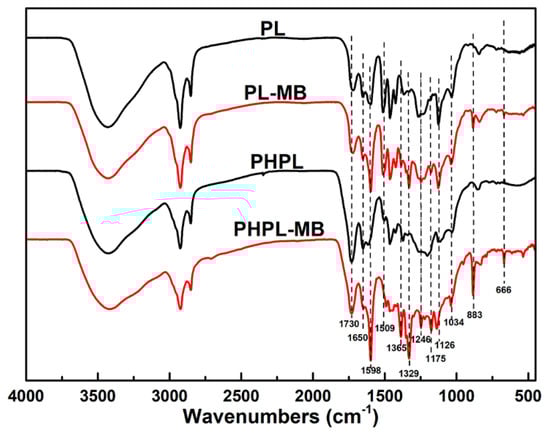 FT-IR spectra of lignin before/after MB adsorption. PL-MB and PHPL-MB refer to the lignin after MB adsorption.