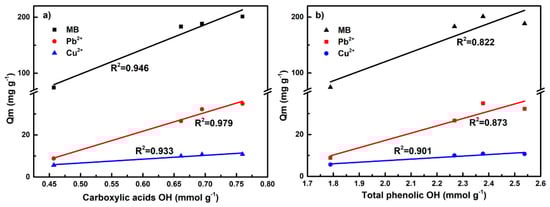Correlation analysis of the content hydroxyl groups and maximum sorption capacities, (a) Carboxylic acids OH; (b) Total phenolic OH.