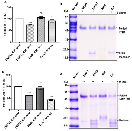 The effect of BME on native TTR dissociation under urea mediated denaturation stress. Bar charts (A,B) represent folded human TTR (hTTR) and L55P TTR, respectively, in percentage left after 72 h of incubation in the presence or absence of BME. Images (C,D) are representative of Tricine-SDS-PAGE images of human TTR and L55P TTR, respectively, after denaturation.