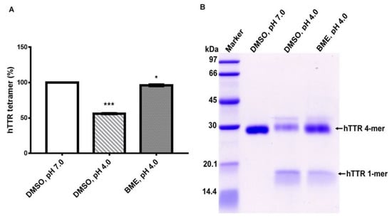 TTR undergoes amyloidogenesis in vitro under mildly acid pH. However, this process requires the dissociation of native TTR tetramers into monomers which are susceptible to amyloidogenic transformation by partial unfolding. To ascertain the effect of BME on human TTR stability under acid-mediated denaturation conditions, the amount of tetramer left after aging the protein for 14 days with or without BME was quantified as described in above. As shown in Figure 3, incubation of human TTR under mild acidity markedly reduced the percentage of tetramers in the absence but not in the presence of 20 µg/µL BME. Correspondingly, the content of monomers produced due to acid mediated denaturation of human TTR was higher in the absence than in the presence of BME as revealed by the monomer band intensity (Figure 3B). These results suggest that BME mitigated human TTR tetramer dissociation under mildly acidic conditions and further supports the earlier results observed under urea mediated denaturation conditions.