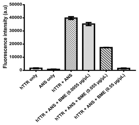 The small fluorescent probe 8-anilino-1-naphthalene sulfonic acid (ANS), is widely used in monitoring ligand or inhibitor binding to the thyroxine-binding site of native tetrameric TTR [23]. ANS binding assay was performed on Synergy HT (BioTek Instruments, Winooski, VT, USA) microplate reader. The ANS stock solution (2.47 mM) was prepared in 10 mM phosphate buffer, pH 7.4 and its concentration was determined by absorbance (E350 = 5000 M−1cm−1) [24]. Human TTR (0.055 µg/µL) was incubated in the presence of 10 µM ANS and varying concentrations of BME (0.0055–0.55 µg/µL). Fluorescence intensity was measured after 10 min at excitation of 360/40 nm and emission at 460/40 nm at a temperature of 37 °C.