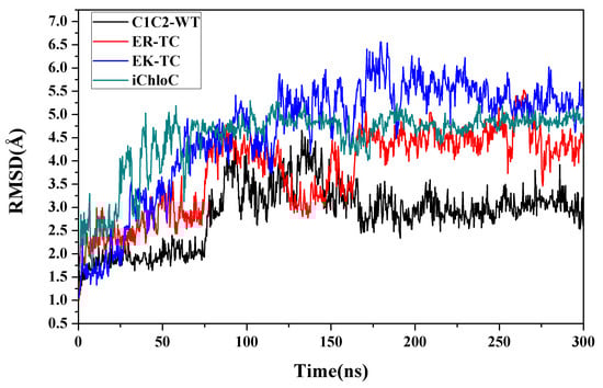 The root mean square difference (RMSD) values of chimeric proteins (C1C2)-wild-type (WT) and mutants EK-TC, ER-TC, and E122Q-E129R-E140S-D195N-T198C (iChloC) over a 300 ns MD simulation.