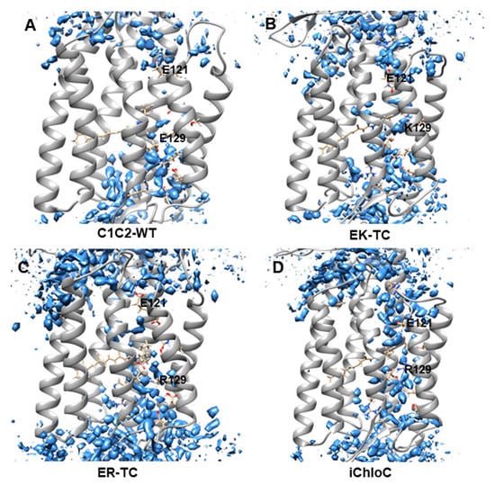 Water distributions of (A) C1C2-WT, (B) EK-TC, (C) ER-TC and (D) iChloC of the last 50 ns after molecular dynamics (MD) simulation trajectory equilibrium. The water molecules are shown in blue.