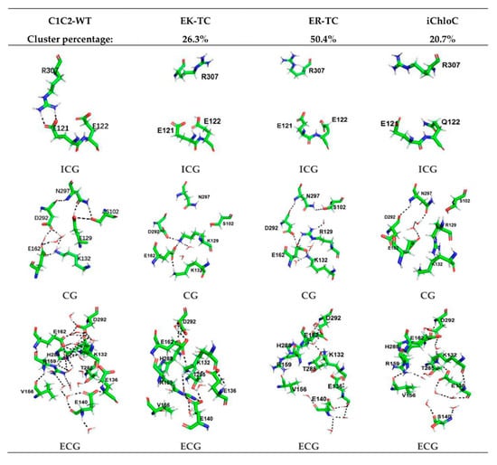 In order to intuitively display the conformational differences of different mutants systems, the K-means algorithm in the MMTSB toolset [] was used for the cluster analysis of simulation trajectories of the mutants EK-TC, ER-TC, and iChloC.