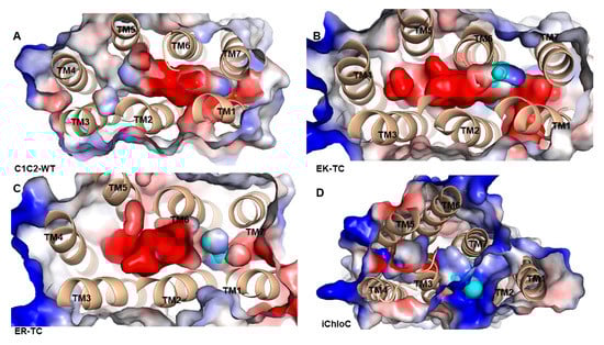 The electrostatic surface potential of C1C2-WT and its mutants were calculated on the pore surface (Figure 4). In C1C2-WT (Figure 4A), an electronegative hole, which consists of negatively charged residues including E122, E129, E136, E140, E162, and D292 was formed among TM1, TM2, TM3, and TM7. These residues contribute to the formation of electronegative surface suitable for cation selectivity. As shown in Figure 4B,C, in the mutants EK-TC and ER-TC, the electrostatic potential formed a small amount of positive potential surface between TM2 and TM7 compared to the wild type. The electrostatic potential around the iChloC pore indicates that the ion channel of the mutant is also electrically positive (Figure 4D). These positive electrostatic potentials make the protein interior accessible to chloride ion.