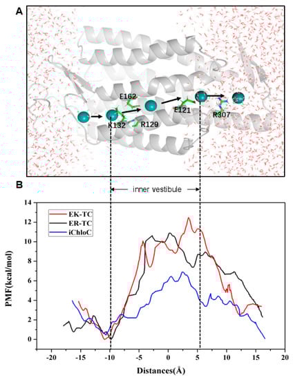 To further understand the selectivity of ion permeation, we adopted SMD simulation to move Cl− through the ion channels of three mutants (Figure 5A), and further estimated the energy changes of ion transmembrane transport of related ions by using the umbrella sampling [] method. The constructed PMF of Cl− through channels of three mutants was shown in Figure 5B. It can be seen from the PMF curve of the EK-TC mutant that it is an energy reduction process for Cl− entering the ion channel. The energy is gradually reduced from 3.90 kcal/mol to 0 kcal/mol, and an energy minimum is reached at K132 of the CG (at about −9 Å). Obviously, there is electrostatic attraction between negatively charged Cl− and positive charged lysine. Hence the outer vestibular part of the ion channel has the ability to capture and enrich chloride ions. Therefore, we suggest that K132 is the binding site of Cl− in the ion channel. Subsequently, Cl− encounters a bottleneck with energy barrier of about 10 kcal/mol in the ion channel. Clearly, as reflected from the PMF, energy increases as Cl− passes through the inner vestibule between the CG and the ICG. After Cl− ions pass through the inner vestibule and ICG (about 7.5 Å), it gradually moves away from ion channel and solvated.