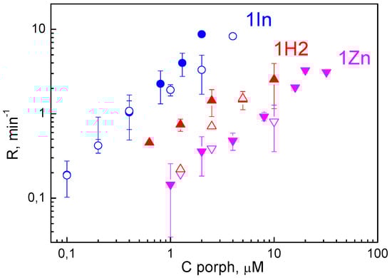 The dependences of R on the concentrations of porphyrins in the solution are presented in Figure 3. The values of R for the cis arrangement of the TM was either the same or insignificantly higher than that for the trans arrangement. The comparison of the R values for three porphyrins shows that their photodynamic efficiency changes along with the boundary potential difference induced by their adsorption: the higher R values were for 1In, and the lower ones were for 1Zn. This indicates that the difference in the efficiency for three porphyrins could correlate with their affinity to BLM. To prove this hypothesis we calculated the surface charge density for adsorbed porphyrin molecules using ζ-potential data and the Gouy–Chapman equation [19].