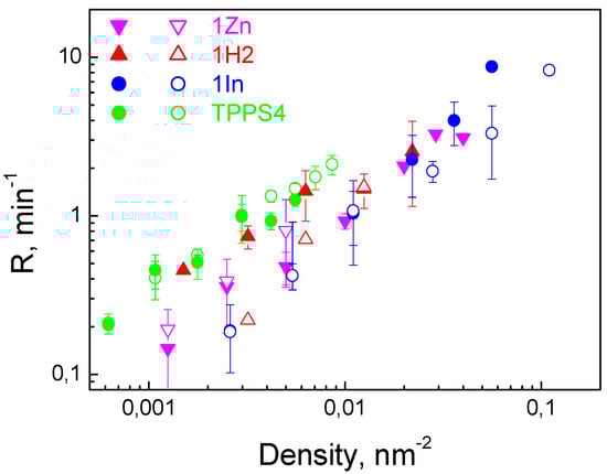 Dependence of the oxidation rate of di-4-ANEPPS on the surface density of porphyrin molecules at the membrane. The data points were taken from Figure 3. Surface density was calculated from the change in the ζ-potential using the Gouy–Chapman equation. Green symbols are the data obtained early for TPPS4 [19].