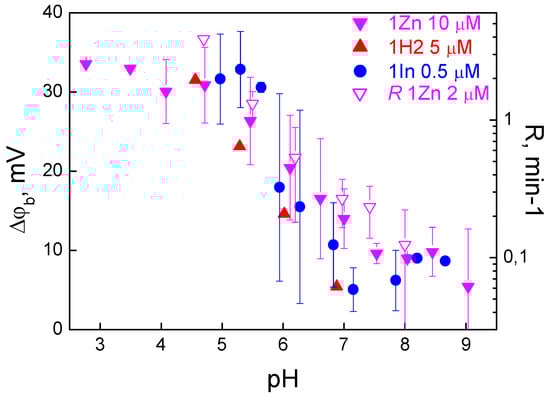 Dependence of the boundary potential due to adsorption of porphyrins (filled symbols, scale on the left) and the oxidation rate R of di-4-ANEPPS (blank symbols, scale on the right) on the pH. The measurements of Δφb are presented for the all three β-imidazolyl porphyrin derivatives, but the oxidation rate—only for 1Zn. Measurements were performed in a buffer solution containing 20 mM KCl, 2 mM HEPES, 2 mM Tris and 2 mM citrate. The pH value was changed by adding HCl or KOH to the solutions on both sides of the membrane.