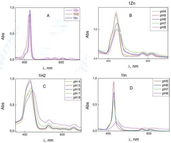 UV-VIS spectra of 5 μM solutions of β-imidazolium porphyrin derivatives in ethanol (A) and in water containing 20 mM KCl, 2 mM HEPES, 2 mM citrate and 2 mM Tris at various pH (1Zn—(B); 1H2—(C); and 1In—(D)).