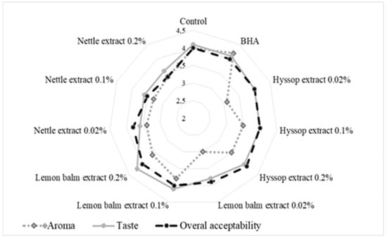 | Lemon balm extract | 0.02% | 66.31 ± 1.23 f | 2.84 ± 0.99 c | 22.66 ± 0.78 a |