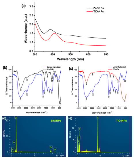 Physicochemical characteristics of zinc oxide nanoparticles (ZnONPs) and titanium dioxide nanoparticles (TiO2NPs) synthesized with lemon fruit extract. (a) ultraviolet–visible absorption spectrum of the colloidal ZnONPs and TiO2NPs; (b,c) Fourier transform infrared spectrum detecting groups in the lemon fruit extract and the green synthetic ZnONPs and TiO2NPs; (d,e) energy dispersive spectrum showing the predominance of Zn and O elements in the ZnONPs and Ti and O elements in the TiO2NPs.