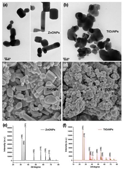 Size and morphology of zinc oxide nanoparticles (ZnONPs) and titanium dioxide nanoparticles (TiO2NPs) synthesized with lemon fruit extract. (a,b) Transmission electron microscopic view of polymorphic ZnONPs and TiO2NPs with dimensions of 20–200 nm; (c,d) scanning electron microscopic view of polymorphic ZnONPs and TiO2NPs; (e) X-ray diffraction pattern indicating crystalline wurtzite structures of the ZnONPs; (f) X-ray diffraction pattern indicating crystalline anatase structures and rutile structures of the TiO2NPs.