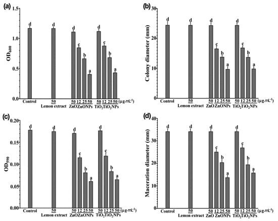 Antibacterial activity against Dickeya dadantii by zinc oxide nanoparticles (ZnONPs) and titanium dioxide nanoparticles (TiO2NPs) synthesized with lemon fruit extract. (a) Dickeya dadantii growth in liquid nutrient broth containing lemon extract (50 µg∙mL−1), ZnO (50 µg∙mL−1), ZnONPs (12, 25, or 50 µg∙mL−1), TiO2 (50 µg∙mL−1), or TiO2NPs (12, 25, or 50 µg∙mL−1) indicated by optical density at 600 nm (OD600); (b) Dickeya dadantii swimming motility indicated by diameters of halo-like colonies formed on semisolid nutrient media with lemon extract, ZnO, ZnONPs, TiO2, or TiO2NPs; (c) crystal violet absorbance at 590 nm (OD590) indicating biofilms formed by D. dadantii with lemon extract, ZnO, ZnONPs, TiO2, or TiO2NPs; (d) diameters of maceration tissues generated by D. dadantii in sweet potato tuber slices after 1 h immersing in lemon extract, ZnO, ZnONPs, TiO2, or TiO2NPs. Mean values with standard errors (vertical bars) are presented; the different letters on the vertical bars indicate significant difference between treatments (p < 0.05).