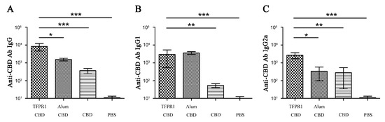 Detection of anti-CBD antibodies in BALB/c mice immunized with TFPR1 and CBD. Female 6- to 8-week-old BALB/c mice were immunized intramuscularly with synthetic HIV-1 CBD (20 μg) plus recombinant TFPR1 (10 μg), and boosted once three weeks later. Mice were immunized with HIV-1 CBD plus alum (volume ratio of OVA to alum is 1:9), HIV-1 CBD alone and PBS as control. Serum was collected on the second week after the final immunization, and anti-CBD-specific antibodies IgG (A), IgG1 (B) and IgG2a (C) were measured by ELISA which coated with HIV-1 CBD (final concentration, 1 μg/mL). The antibody titer was expressed as the reciprocal of the largest dilution of serum which OD450 value was greater than average OD value of negative serum plus two-fold of SD. One-way ANOVA was used for statistical analysis.* denotes p<0.05, ** p < 0.01, *** p < 0.001.
