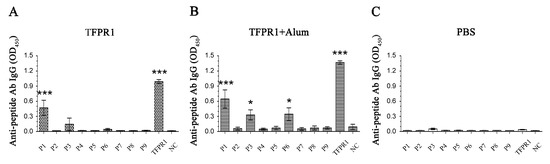 Identification of the B cell dominant epitopes on TFPR1. Female 6- to 8-week-old BALB/c mice were immunized intramuscularly with TFPR1 (10 μg) alone (A) or TFPR1 plus alum (volume ratio of OVA to alum is 1:9) (B), endotoxin-free PBS alone (C) was used as the control; and boosted once three weeks later. Serum was collected on the second week after the final immunization, and anti-peptide-specific antibodies IgG were measured by ELISA which coated with each synthetic peptide, P1–P9 (final concentration, 2 μg/mL), and TFPR1 as positive control. Data was presented as the OD450 value at 1/20 dilution. One-way ANOVA was used for statistical analysis. * denotes p < 0.05, *** p < 0.001.