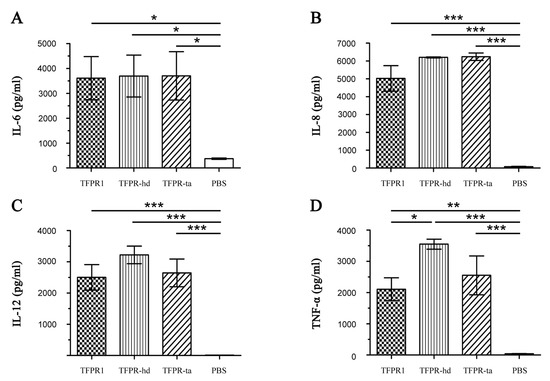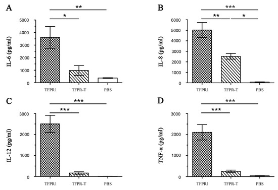 Because TFPR1 can efficiently activate dendritic cells to produce high levels of proinflammatory cytokines [25], we then analyzed whether TFPR-T also reduced its ability to stimulate dendritic cells to secrete cytokines. Bone marrow-derived DCs were incubated with either TFPR-T or TFPR1 for 24 h, and ELISA was performed to compare their cytokine secretion. TFPR-T hardly induced any cytokines other than IL-8 (2528 pg/mL, p < 0.05 vs. PBS), and significantly lower levels of IL-6, IL-12 and TNF-α than TFPR1 (Figure 5). These results indicate that the reduced adjuvanticity of TFPR-T is linked to ineffective activation of dendritic cells to secrete cytokines.