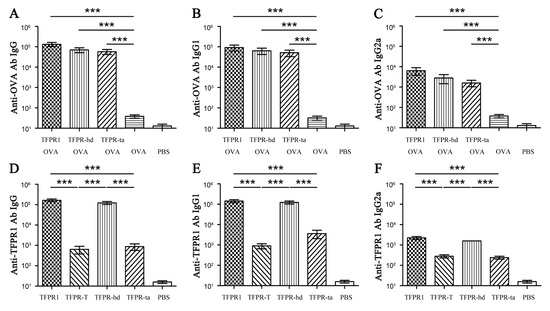 Detection of anti-OVA and anti-TFPR1 antibodies in BALB/c mice immunized with OVA and TFPR-hd or TFPR-ta. Female 6- to 8-week-old BALB/c mice were immunized intramuscularly with endotoxin-free OVA (10 μg) plus recombinant TFPR-hd or TFPR-ta (10 μg), and boosted once three weeks later. Mice were immunized with OVA plus TFPR1, OVA alone and PBS as control. Serum was collected on the second week after the final immunization, and anti-OVA-specific antibodies IgG (A), IgG1 (B) and IgG2a (C) were measured by ELISA which coated with OVA (final concentration, 1 μg/mL), meanwhile, anti-TFPR1-specific antibodies IgG (D), IgG1 (E), and IgG2a (F) were measured by ELISA which coated with TFPR1 (final concentration, 1 μg/mL). The antibody titer was defined as the reciprocal of the largest dilution of serum which OD450 value was greater than OD value of negative serum plus two-fold of SD. One-way ANOVA was used for statistical analysis, denotes p < 0.001.